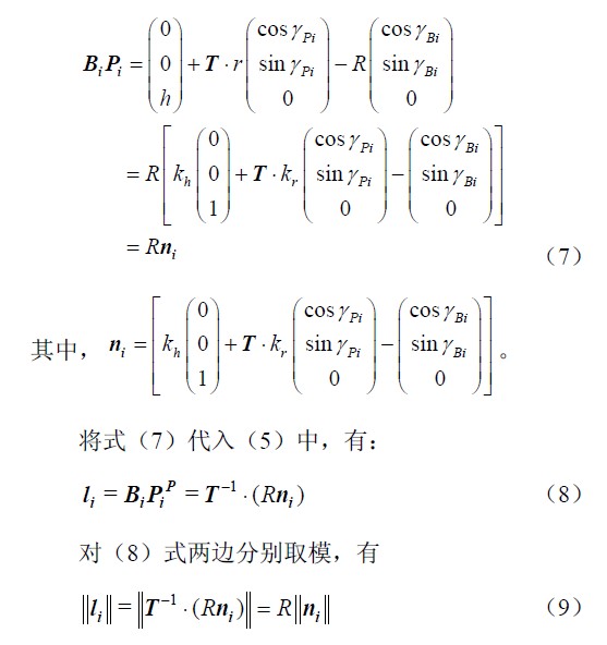 在動(dòng)平臺(tái)P1P2P3 上建立動(dòng)坐標(biāo)系OP-XPYPZP(圖 2),在靜平臺(tái)B1B2B3上建立靜坐標(biāo)系O-XYZ。靜平臺(tái) 半徑為R,動(dòng)平臺(tái)半徑為r,中央立柱的高度為h。轉(zhuǎn) 臺(tái)球鉸鏈數(shù)學(xué)模型可以通過支鏈BiPi在動(dòng)坐標(biāo)系中的 位置矢量BiPi P 來描述。BiPi P 與球鉸法線n0 的夾角即 為球鉸鏈的轉(zhuǎn)角α。 動(dòng)坐標(biāo)系OP-XPYPZP 到靜坐標(biāo)系O-XYZ 的旋轉(zhuǎn)矩陣為:
