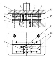 沖壓過程:① 剪床裁料:把寬度不規(guī)則的邊角 料按需要的長度挑選,剪裁成Lx45 mml② 第1 工 步:條料置于導料卸料板9和12之間,步距定位銷 10定位,沖槽,卸料;③第2工步:第1次預彎、沖槽, 彈性浮料銷浮料、卸料;④第3工步:第1次預彎、沖 槽、第2次預彎,彈性浮料銷浮料、卸料;⑤ 第4工 步:第1次預彎、沖槽、第2次預彎、彎圓,彈性浮料 銷浮料、卸料;⑥完成零件加工。