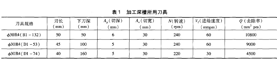 編深槽程序時,將刀具分三個系列,先用 φ 30R4 下刀深為50mm銑刀加工上半部分,再用 φ 30R4下刀深為100mm加工中間部分,最后用 φ3oR4下刀深為160mm加工底部。側(cè)面用 φ 30R4銑刀加工到位,僅用 φ 20R4銑刀補銑轉(zhuǎn)角。編制加工耳片型面程序時,通過改變刀軸方向, 實現(xiàn)應(yīng)用最短刀具加 工。(所用刀具見表1)