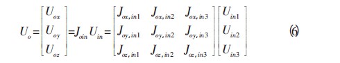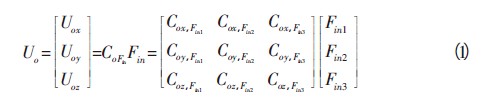 式中:向量[Uox Uoy Uoz]T3個(gè)分量—X、Y方向上的位移和繞Z軸轉(zhuǎn)動(dòng)角度;[Fin1 Fin2 Fin3]—施加在如圖1所示的驅(qū)動(dòng)端的輸入力,柔度矩陣CoFin的每一列表示在某一驅(qū)動(dòng)力對(duì)輸出位移的影響,其每一行表示所有驅(qū)動(dòng)力對(duì)某一方向輸出位移的作用。