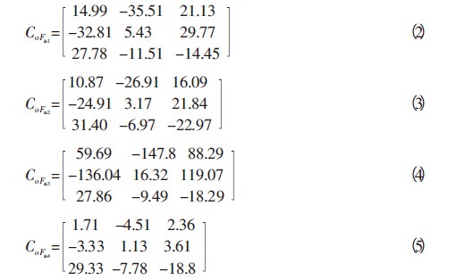 (2)測量輸出端的各個(gè)位移,則可以得到相應(yīng)的柔度矩陣的某一列元素,則可以得出四種不同柔性鉸鏈平臺(tái)的柔度矩陣分別如下: