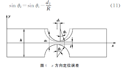 理想鉸鏈的上下切口圓弧是嚴(yán)格對(duì)稱的,采用鉆孔或者電火花切割加工時(shí),切口圓弧中心x 方向定位誤差d2如圖4所示,由圖可知
