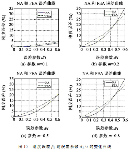 結(jié)合計(jì)算結(jié)果和圖9可知,NA 和FEA 的誤差曲線較為吻合,鉸鏈參數(shù)m 對(duì)誤差β1幾乎沒有影響,但是誤差系數(shù)d1/t對(duì)剛度的影響較大,?。恚剑埃?,當(dāng)誤差系數(shù)d1/t為0.3時(shí),NA和FEA的剛度誤差分別可達(dá)93.44%和82.5%。