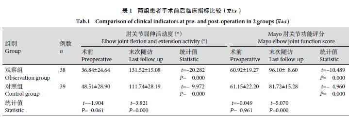 對(duì)照組:男28例,女11例;年齡16~59歲,平均33.7歲。致傷原因:創(chuàng)傷性21例,滑膜炎11例,骨關(guān)節(jié)炎7例。原始損傷診斷類型:肘關(guān)節(jié)損傷三聯(lián)征2例,鷹嘴骨折8例,經(jīng)鷹嘴骨折脫位2例,合并尺骨鷹嘴骨折6例,尺骨骨折2例,合并肱骨鷹嘴骨折3例,肱骨骨折12例,橈骨骨折4例。受傷至手術(shù)時(shí)間5~210個(gè)月,平均30.1個(gè)月。兩組患者性別、年齡、致傷原因、原始損傷診斷類型、受傷至手術(shù)時(shí)間及術(shù)前肘關(guān)節(jié)屈伸活動(dòng)度、Mayo肘關(guān)節(jié)功能評(píng)分等一般資料比較差異均無(wú)統(tǒng)計(jì)學(xué)意義(P>0.05),具有可比性。見(jiàn)表1。