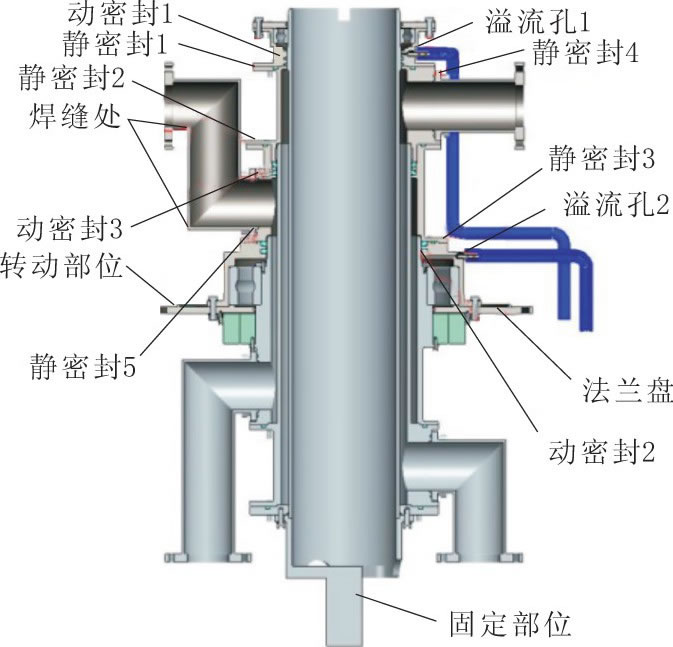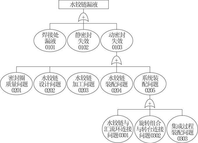 因此, 漏點定位在0103動密封1處。針對動密封1的失效原因, 按圖2故障樹逐層分析排查發(fā)現是由系統(tǒng)裝配過程中水鉸鏈與匯流環(huán)的連接問題 (0301) 所致。