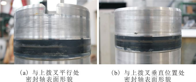 離該水鉸鏈與匯流環(huán)連接處最近的動密封1在偏載荷作用下, 其壓縮率已超過動密封圈容許值的近50%, 遠遠超過起補償作用O型圈的補償能力。從圖3密封圈的解剖形貌和圖5對應密封軸的解剖形貌也可看出:動密封1的齒形滑環(huán)已被磨平, O型圈出現不可恢復的變形, 對應密封軸磨損也最嚴重, 因此動密封1率先出現漏液。隨著長時間這種不同軸偏心運轉, 動密封圈的磨損不斷加劇, 齒形滑環(huán)與密封軸的接觸面積越來越大, 摩擦力矩隨之逐漸增大, 泄漏越來越嚴重, 所以會出現天線連續(xù)旋轉時間越長, 旋轉過程中泄漏率越大的情況。