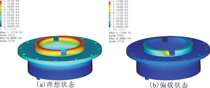 為此, 對水鉸鏈建有限元模型, 分別對其在理想狀態(tài)下 (僅受到匯流環(huán)帶來的100N·m扭矩作用) 與偏載狀態(tài)下 (受到匯流環(huán)帶來的100N·m扭矩和0.4°偏擺角的共同作用) 進行力學仿真分析, 分析結果如圖6所示。