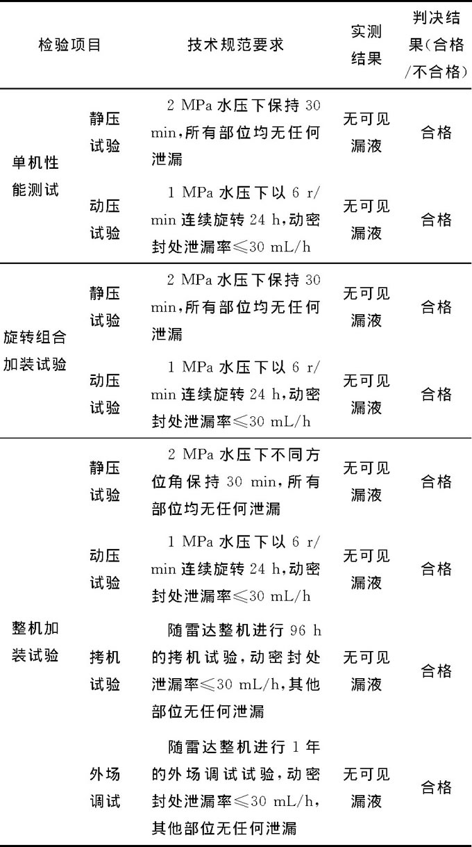 經過改進后的水鉸鏈已通過單機性能測試試驗、與匯流環(huán)集成旋轉組合后的壓力測試試驗, 以及整機加裝試驗, 并已隨雷達整機進行96h拷機試驗及1年的隨雷達整機外場調試試驗, 試驗情況和試驗結果如表1所示。結果表明, 改進水鉸鏈各項性能表現良好, 無任何故障出現。