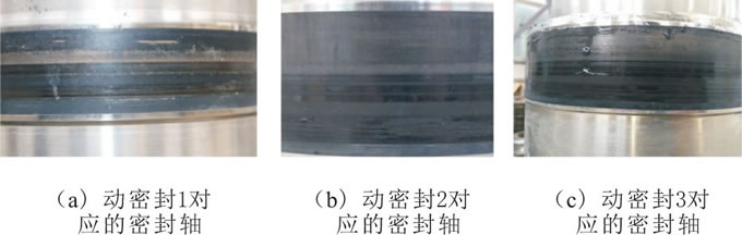 c.解剖發(fā)現, 離該水鉸鏈與匯流環(huán)連接處最近的動密封1磨損最嚴重, 離該連接處較遠的動密封2和動密封3僅有少許磨損 (如圖3所示) , 因此動密封1對應的密封軸磨損也最嚴重 (如圖5所示) 。