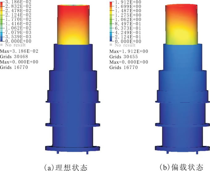 由力學仿真分析可知, 水鉸鏈在理想狀態(tài)下, 內軸上端的最大變形量為0.032 mm;在偏載狀態(tài)下, 離該水鉸鏈與匯流環(huán)內軸連接部位越近變形量越大, 并且水鉸鏈內軸最頂端與撥叉方向垂直的部位變形量最大, 最大變形量為1.91mm。