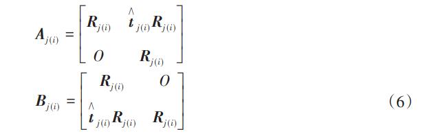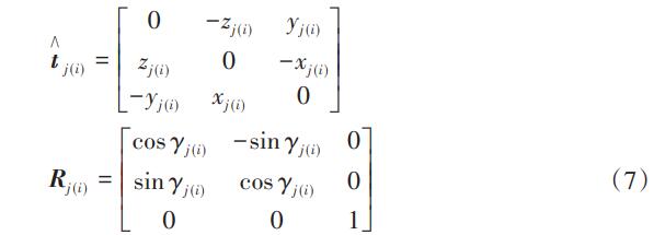 式中:Rj (i)為坐標(biāo)系{oi}關(guān)于{oj}的方向余弦矩陣,其變量為繞Z坐標(biāo)軸的旋轉(zhuǎn)角度γj (i);t j (i)為坐標(biāo)系{oi}關(guān)于{oj}的反對(duì)稱移動(dòng)矩陣,其變量為沿X、Y和Z坐標(biāo)軸的平動(dòng)量,即(xj (i),yj(i),zj(i)):