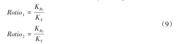 對(duì)于半輪型柔性鉸鏈,工作方向?yàn)槔@Z軸轉(zhuǎn)動(dòng)的Rz方向,X、Y方向則為非工作方向。施加的載荷主要為繞Z軸的轉(zhuǎn)矩Mz和xOy平面內(nèi)的力,所以半輪柔性鉸鏈發(fā)生的變形和寄生位移均發(fā)生在xOy平面內(nèi),因此本節(jié)只需考慮xOy平面內(nèi)的相對(duì)剛度。將剛度矩陣(10)中可得半輪型柔性鉸鏈相對(duì)剛度Ratio1、Ratio2為:
