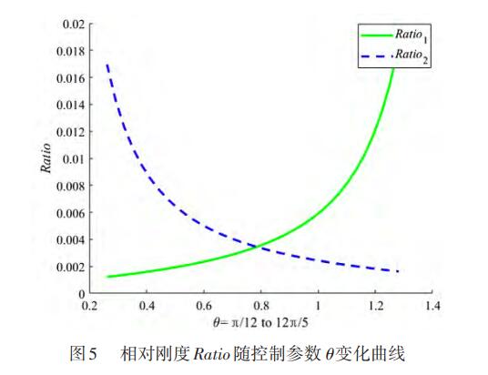 θ對(duì)Ratio1、Ratio2的影響如圖5所示。由圖可以看出,Ratio1的值隨θ的增大而增大且在階段變化顯著;相反地,Ratio2的值隨θ的增大而減小且在變化顯著,但兩條變化曲線是非對(duì)稱的。且在θ=45°的情況下,Ratio1=Ratio2。