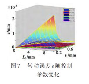 提取半輪型柔性鉸鏈總剛度矩陣(8)中對(duì)應(yīng)位置剛度,并代入式(10),得到控制參數(shù)點(diǎn)坐標(biāo)(L1,t1)與子柔性單元位置狀態(tài)量角度θ對(duì)半輪型柔性鉸鏈轉(zhuǎn)動(dòng)誤差影響如圖7所示。從圖中可以看出,在位置角度θ一定的情況下,變量L1越大,即梁的長度越長,半輪型柔性鉸鏈轉(zhuǎn)動(dòng)誤差e越大;變量t1越小,即梁的厚度越薄,半輪型柔性鉸鏈轉(zhuǎn)動(dòng)誤差e越大。軸轉(zhuǎn)動(dòng)誤差e隨θ的增大而減小,并且在15°~30°變化明顯,在45°~75°變化將不再明顯。