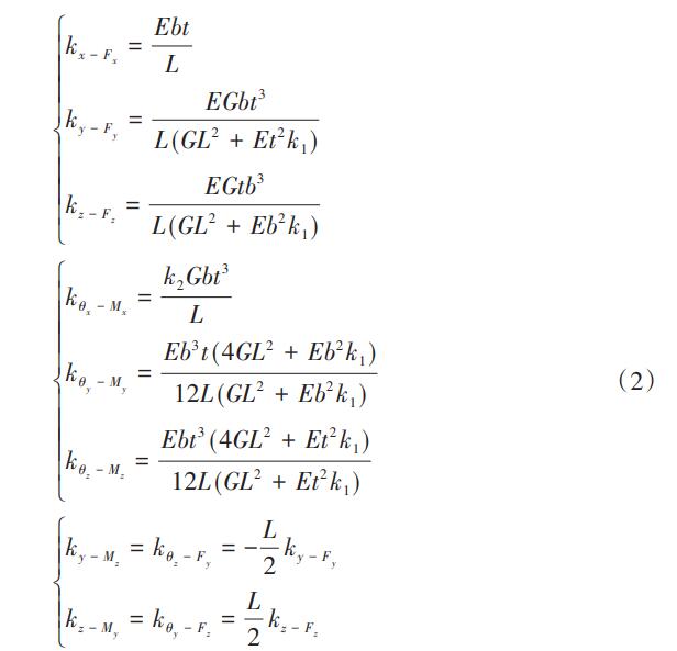 式中:E為楊氏模量;G為剪切模量;k1為剪切修正系數(shù),對(duì)于矩形截面k1=6/5;k2為矩形截面自由扭轉(zhuǎn)時(shí)的抗扭截面系數(shù)的因數(shù),其取值為“橫截面長/寬”相關(guān)的因數(shù)。