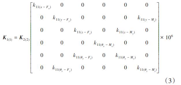 將上述數(shù)值和參數(shù)代入剛度矩陣(1)、(2),并計(jì)算可得到各子柔性單元(1、2)關(guān)于其各自局部坐標(biāo)系的剛度矩陣K1(1)、K2(2)分別為:
