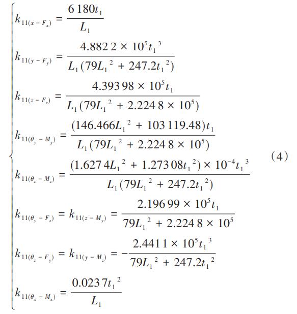 在該半輪型柔性鉸鏈中,子柔性單元1、2形成并聯(lián)結(jié)構(gòu)。在同一坐標(biāo)系中,其末端剛度為各并聯(lián)單元的剛度之和。為計(jì)算半輪型柔性鉸鏈對(duì)雙側(cè)驅(qū)動(dòng)系統(tǒng)在各方向的支撐剛度,各單元的剛度矩陣應(yīng)整合至坐標(biāo)系{O3,X3,Y3,Z3}中。